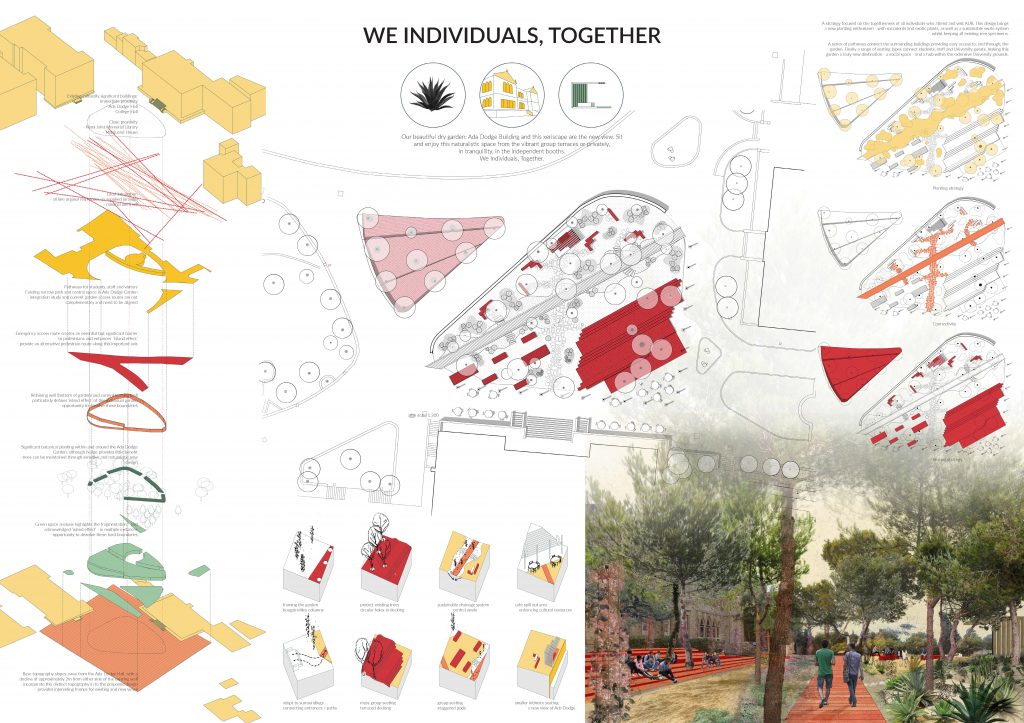 These new habitats employ drought tolerant planting and water conservation techniques. The Ada Dodge Building and planted xeriscape become the new view, offering multiple focal points in addition to the existing sea horizon. The garden becomes a space for looking inwards; not just outwards. It brings people, and the University’s distinctive built and green cultural resources, together.