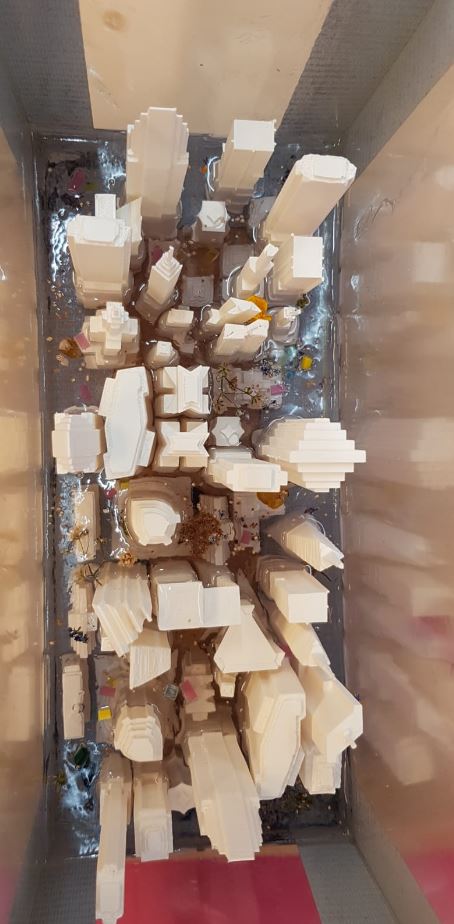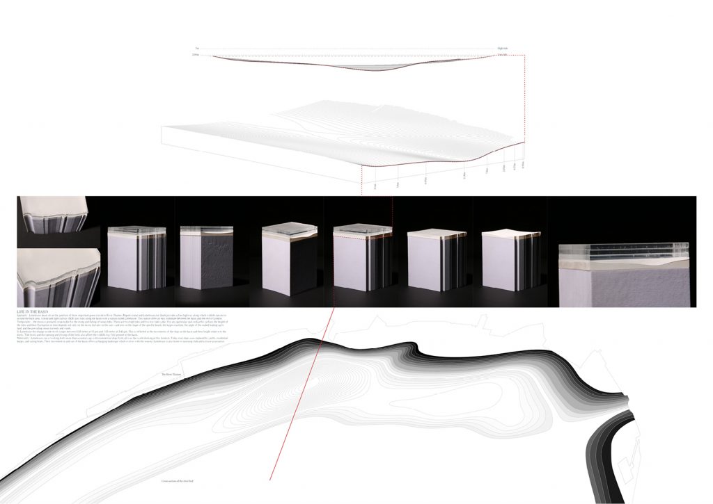 These are physical models that I designed to illustrate my landscape projects. The first six photographs correspond to a 3D printed model for the project ‘Island factories’, the seventh is a maquette of Walworth in Lodon with my design in white resin, and the eighth is a 3D mapping of river Thames at Limehouse.